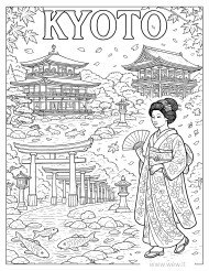 Šis spalvinimo paveikslėlis skirtas kelionėms ir Japonijos kultūros mėgėjams. Paveikslėlyje vaizduojami garsūs Kioto miesto simboliai: pagodos ir kiti tradiciniai pastatai, sodas su tvenkiniu ir jame plaukiojančiomis karpinėmis žuvimis, vartai ir moteris, apsirengusi kimono. Aiškios kontūro linijos leidžia kruopščiai spalvinti ir atgyvinti šį unikalų piešinį. Šis paveikslėlis puikiai tinka tiek vaikams, tiek suaugusiems, norintiems atsipalaiduoti ir pasinerti į kūrybos procesą. Išspalvintas Kioto peizažas gali tapti puikia dekoracija namuose.