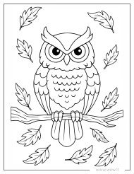 Detaliai nupiešta pelėda su rudens lapais. Spalvinimo paveiksliukas vaikams.