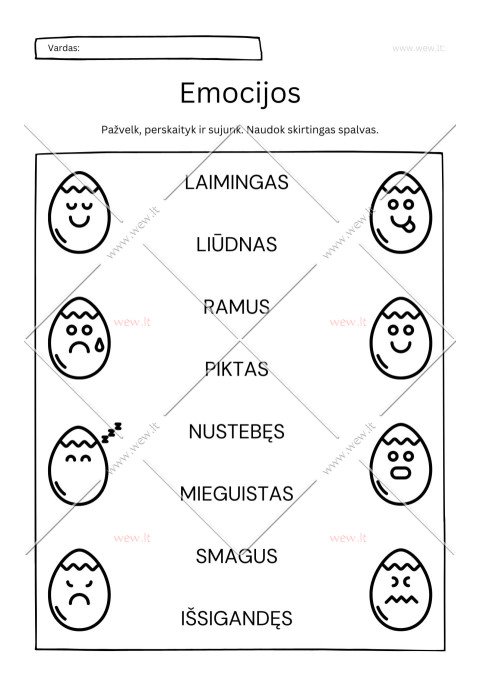 1. Susieti: prijungti kiekvieną emociją (veidelį) prie tinkamo pavadinimo, naudojant skirtingas spalvas. Tai gerina rankos-akies koordinaciją ir smulkiąją motoriką.