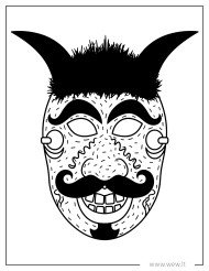 Išraiškinga velnio kaukė su dideliais ūsais, ragais ir veltinio stiliaus plaukais. Šis spalvinimo šablonas pasižymi žaismingomis detalėmis ir tradiciniais Užgavėnių akcentais, todėl puikiai tinka kurti unikalų šventės kostiumą. Atsispausdinkite, nuspalvinkite ryškiomis spalvomis ir tapkite linksmu persirengėlių eitynių dalyviu.