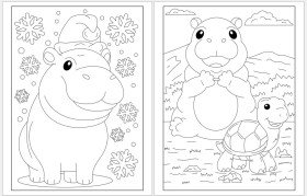 Šiame spalvinimo puslapių rinkinyje (10 spalvinimo puslapių) vaikai ras mielą begemotą, kuris keliauja po snieguotas lygumas, susitinka su draugais ir net pasimatuoja karaliaus karūną.