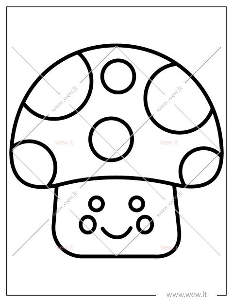 Šiame paveikslėlyje matome linksmą grybuką su didele, taškuota kepure ir miela šypsena. Vaikai gali nuspalvinti grybo kepurėlę ryškia raudona spalva, o taškučius palikti baltus arba paversti juos spalvotais burbulais. Tai paprastas ir smagus būdas mažiesiems lavinti vaizduotę bei kruopštumą spalvinant.